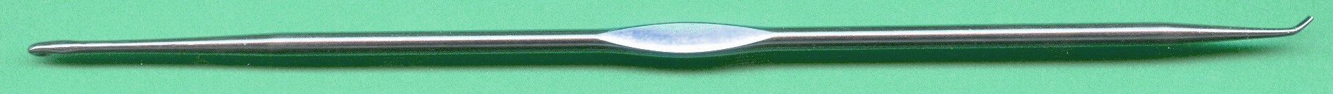 Spitz-Decker, gebogen zum Hochhängen von Maschen, z.B. aus vorherigen Reihen (Kräusel-, Wellenmuster) für Feinstricker